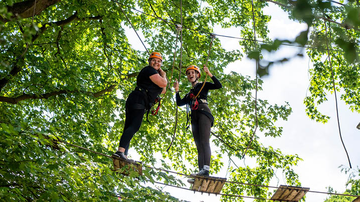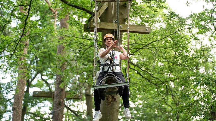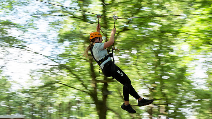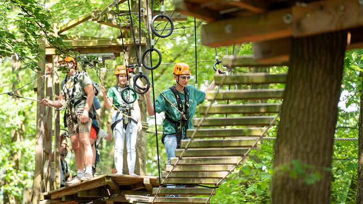 Voor de echte durfals begint het avontuur in de boomtoppen. Via uitdagende parcoursen klim je steeds hoger en trotseer je ziplines. Hier draait alles om lef en doorzettingsvermogen, terwijl collega’s elkaar aanmoedigen of zelf de uitdaging aangaan. Voor degene die klimmen in het begin spannnend vinden, is er ook een laag parcours, waardoor iedereen de ervaring van het klimmen kan beleven.